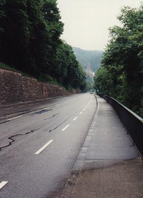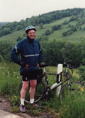 Shortly after leaving Eberbach, we found our first of what was to be many detours - umleitung. We couldn't read the German, but it was obvious that cars were being rerouted. However, when we saw a car bypass the sign, we decided to continue on ourselves. Soon, we came upon a ribbon similar to those used on crime scenes blocking the entire entrance to the rest of the road, and another detour sign. We stopped long enough to let a car pass under the banner from the blocked off side. That was our invitation to continue. Besides, after consulting the map, we figured the detour would add on another 15 km of riding through some very hilly terrain. As we continued riding we could see the reason for the detour - there was road work in progress. To be more accurate, workers were cutting down trees along side the road, and some portions were blocked entirely by tree debris. No problem for a couple of dumb Canucks on bikes. One of the workers started gesturing to us, and after realizing we did not speak German, he motioned us on while admonishing us with his index finger (you naughty, naughty boys). Today we had rain almost all day. As the day wore on, the rain seemed to increase in intensity. There were many hills on this day as well. In Bad Wimpfen, we decided not to go all the way into town because of the hills, and because this would be a very long day cycling as it was (yeah, I know - a feeble excuse). We stopped at the rail station - about halfway up the steep incline into the altstadt. Here, Tom ordered six of something neither one of us could make heads or tails of, but we thought it sounded as if they were something like sausage. About ten minutes later the waitress arrived with Tom's order of six snails! Escargot is spelt schnecken in Deutsche! Just after leaving Bad Wimpfen, and crossing the Neckar River, we encountered a long, steep hill that ended at the junction of a road near a churchyard. I made it up the hill first, and while waiting for Tom, started a conversation with a 62 year old German gentleman with a one-speed coaster bicycle. He commented on how he would love to travel to North America. After Tom made it up the hill, this man directed us to a cycle path that would take us all the way to Mockmuhl without the traffic of the main road. And it was paved most of the way! He would even lead us to the entrance. I wished we had met this cyclist prior to the long hill, as he lead us down once again. His rear tire wobbled visibly from side to side as we made the descent at speeds in excess of 45 kph. The cycle path lasted 24 km., following the twisting path of the Jagst River valley. In Mockmuhl, we refueled on donut like pastries at a local bakery. The rest of the day was uneventful for the most part - just more rain! We got slightly "lost" in Dorzbach, where we left the Jagst River valley and headed up a long hill northeast towards Bad Mergentheim. The guidebook indicated the uphill would last about 8 km, followed by a long 6 km descent into the city. I did not seem to find it that long - perhaps 5 km, followed by a 6 km descent. In any event, it was nice to coast into town. Our total mileage for the day: 133.8 km in 6 hours, 53 minutes, for an average speed of 19.4 kph. Bad Mergentheim was the birthplace of my German friend, Birgit (with whom we would be staying at the end of our trip). She had asked if I could take a photograph of the hospital where she was born, as she had not been back "home" for many years. Unfortunately, it was raining fairly hard, so we bypassed this opportunity without too much thought. The first pension we checked out on the road into town, just after the hospital was full. We rode downtown where we were given directions to a local hotel. This hotel quoted us 148 DM for the night - a marked increase over what we were used to paying. Sensing we did not want to spend quite that much money, the receptionist called around to a couple other hotels in the area, then redirected us to the Hotel Wolfgang. This hotel was priced at 100 DM for the two of us, which included "fruhstuck," or breakfast. Hotel Wolfgang was very nice with big rooms. They also allowed us to store our bikes in their garage for the night. For dinner we wandered down to the markplatz where there appeared to be a blood donor clinic in progress, with entertainment provided, as well as food and refreshments. I considered giving a pint, but I wasn't quite sure how well I would perform on the bike for the next week. I passed on this opportunity. We found a very nice Greek restaurant right next door to all the festivities. After the standard menu items, we once again indulged in that great German pastime - drinking beer. Tom had pils, while I once again had weisenbier. |