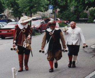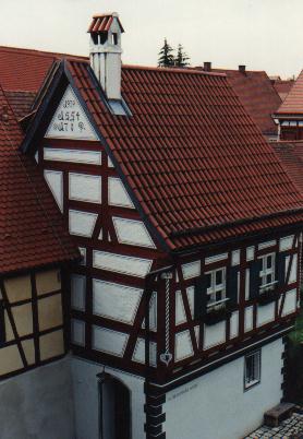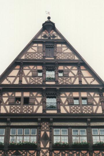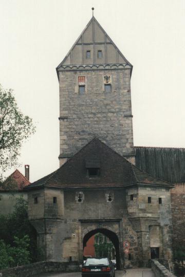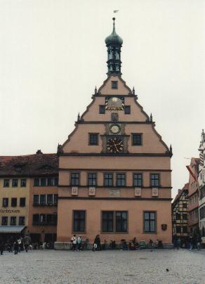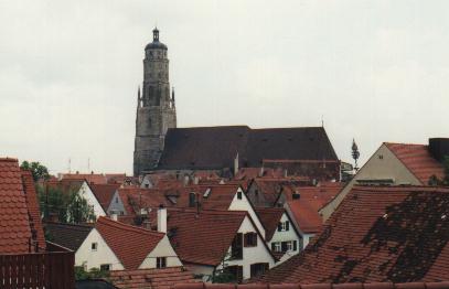 Today it started out sunny, but by the time we started out on our bikes, it had clouded over. This route had constant hills. But for every uphill, there was at least an equal downhill. Today I reached 57 kph going downhill. Due to lots of rain, and melt water from the Alps, some of the bike paths were flooded along the Tauber River. At one spot we had to turn back and ride the road due to the cycle path being submerged. At another point we had to ride through 12" of water to reach a bridge to cross the Tauber. People on the other side of the bridge seemed eager to take our picture as we did this. Tom was the first to cycle through. He went slowly, and faltered, having to put his foot into the cool water to prevent himself from falling. I would try a different technique. I moved back from the stream to gain a bit of speed. After hitting the water at about 15 kph, I came to an abrupt halt, but was able to stay upright - real good thing, as my feet were clipped into my pedals, and it would have been very embarrassing - not to mention very wet! The water was actually 1/2 way up my front panniers on the lowriders. I didn't have to put my feet down to get my feet wet, as they were already submerged while pedaling. I told Tom that this would make a great picture that we would always remember. Tom suggested I ride through the stream again while he took my picture, but I gratefully declined his "generous" offer. We ate lunch in the medieval town of Rothenburg. Rothenburg is probably one of the most famous towns in Germany. Once again, in keeping with Germany tradition (as perceived by us cyclists), this town was found perched high above (well, several hundred feet, anyway) the River Tauber. Rothenburg initially had very prosperous times back in the medieval period. It was declared a Free Imperial City, but as it found itself cut off from major trading routes, it vegetated into a very provincial market town. In 1945 the town suffered some damage from American bombing, but due to the efforts of an American civilian, working with the US army, the town was spared further bombing. Rothenburg is one of the best preserved medieval cities in the world. Even today, its conservation policies are the strictest in Germany. Even McDonalds is obliged to carry on this tradition by displaying only a small steel sign and flag outside its entrance by the marktplatz. After a quick tour of the town, we once again departed for Dinkelsbuhl at 2:45 p.m. We arrived in Dinkelsbuhl at 5:45 p.m. As a festival was on - the beginning of the Whit Sunday and Whit Monday holiday, there were no rooms to be found. After calling about 12 different hotels, pensions, and zimmer freis, without success, we turned to plan "B." As Tom's knee was starting to bother him due to the constant hill climbing of the day, and because a cycle ride to the next "major town" would put us in the dark, we would take a bus to Nordlingen, about 30 km away and stay there for the night. The bus ride took about 30 minutes, and cost 7.90 DM apiece, including our bikes. There were very few rooms to be had here as well. We were lucky enough to have the one hotel owner call about five different hotels before securing as a room close to the local McDonalds, and right next door to the Judenherberge (youth hostel). This was the Hotel Schutzenhof, just outside the city walls, and a relative bargain at 59 DM apiece, including breakfast. We were not about to argue. Today were very happy, as we did not get any rain, just twenty minutes of very light drizzle. Total mileage for the day: 103.5 km, in hours, minutes, for an average speed of 17 kph. Nordlingen is a also a medieval city with a surviving wall surrounding it. During medieval times this wall provided protection for those living within. Nordlingen is built in the crater of a meteorite that crashed to earth many years ago. The Apollo astronauts trained here in Nordlingen. As a mark of their gratitude, they presented the city with a chunk of moonrock which is on display in one of the local museums. The fact that they are extremely proud of this chunk of rock was illustrated at dinner, when one of the local elders sat with us during our meal. His English was very limited, but was much more extensive than our German, but I think he mentioned that moon rock no less than 12 times over the course of two weisenbier. I think in some ways that Nordlingen proves to be a better example of a medieval city than Rothenberg. For one thing, it has fewer tourists, so there are fewer people to interfere with you being a tourist. Because there are fewer people milling about, many of the ancient buildings are also easier to preserve. |