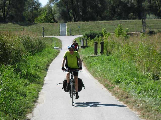 At 08:00 we left the Hotel Nestroy for a quick bite to eat at a local café. Here Tom picked up some fruit for the journey ahead. We then walked back to the hotel to gather our panniers and Kevin’s bike, and proceeded to walk to Pedal Power. This is the bike shop where Tom and Brent had rented bikes for the trip. The bikes they were presented this day were actually lighter than the ones they had tried out the previous day, but still were quite heavy compared to what they were used to. Tom was initially disappointed at the weight of the 24 speed KTM bikes. But his hesitation proved to be ill conceived as the bikes, with their front wheel shocks, were well suited to the occasional rough paths that we were about to experience in the days ahea.