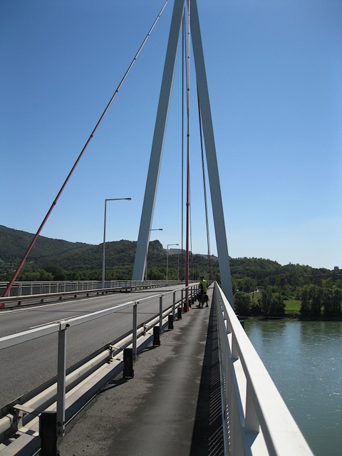 Once past the chemical plant we rode on top of the berm of a dike for about 15 kilometres, most of which was quite straight. The path was in excellent condition and there were many cyclists. This area was not very picturesque. Eventually we reached the Bad Deutsch Bridge in Altenburg that we used to once again cross the Danube towards Hainburg, Austria. We had lunch in a café overlooking the Danube, where we watched tour boats and barges slowly ply their way up and down the river. We cycled into the centre of Hainburg to take some photos, then returned to the bike path leading us through Austrian farmland towards Bratislava. By now we could see Bratislava in the distance, prior to crossing the border from Austria to Slovakia. At the border we could see remnants of an old Soviet style border crossing, which was now abandoned; otherwise the border was not even noticeable.