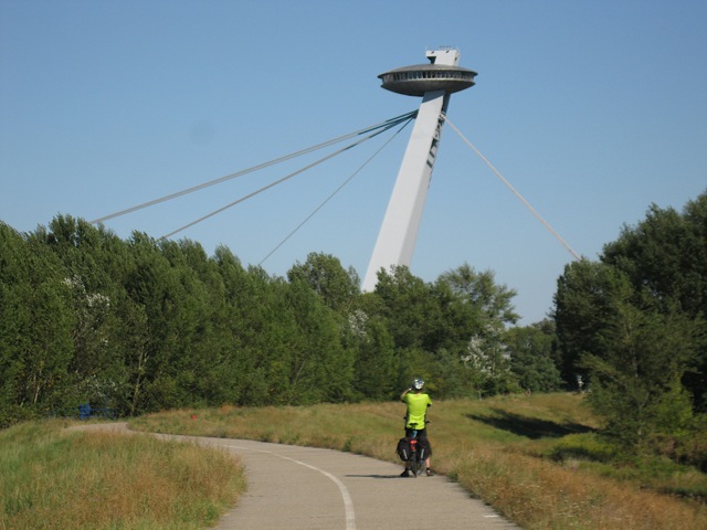 The staff at Pedal Power was very helpful, as they provided us with information on the route from Bratislava to Budapest, and recommendations on how to return to Vienna by train. After installing our panniers on the bikes, we headed towards the Reichsbrücke Bridge that took us across the Danube River. We cycled for several kilometres along a narrow island surrounded by the Danube until we reached a chemical plant, and a smokestack that was painted with alternating red and white stripes. Along this section of the Danube we saw many unnaturally tanned nude sunbathers (which we affectionaly referred to as Viennese fishermen - although there were "fisherwomen" in attendance as well). We had been warned that the road through the chemical plant was not obvious, and indeed we missed the turnoff. After about a kilometre, while consulting a map a hiker came up and re-directed us to the proper turnoff. Yahoo - we got to pass the Viennese fisherman once again!