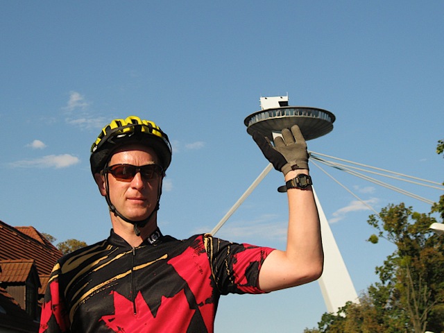 After a hearty breakfast of scrambled eggs, fried eggs, toast, and pastries, we prepared to leave the Art Hotel William. We seemed conspicuosly under-dressed, in our colourfully attired spandex outfits, as we exited with our bikes through the well-appointed lobby with it's glass foyer doors onto the cobblestones of the main square. Our discomfort soon melted as we cycled our way through the old centre of Bratislava. We again crossed the Danube on the Novi Most Bridge. This bridge has a restaurant and an observation deck that looks much like an UFO has landed on top of the bridge. The "UFO" stands 85 metres above the ground. The bridge was built between 1967 and 1972, and is the world's 7th largest suspension bridge.