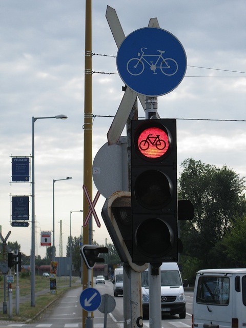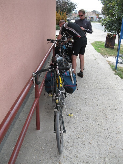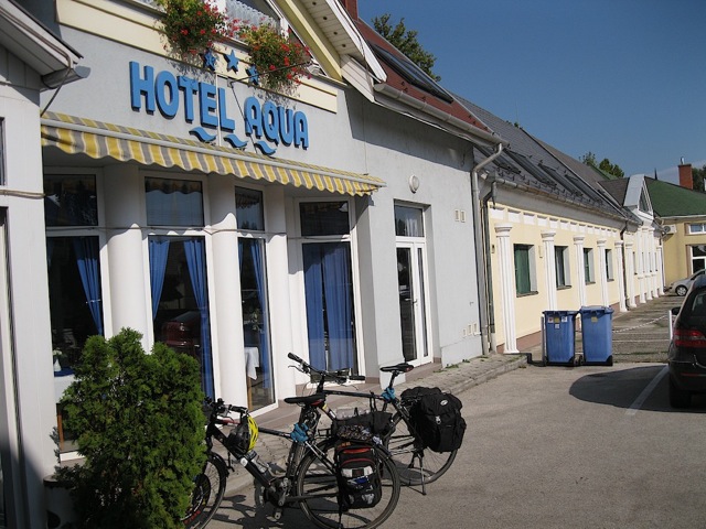 Leaving Ács, we noticed a sign that had been modified by hand (that is to say, a piece of tape covered the straight arrow) that directed us to turn left instead of going straight. It seems the original route was deemed “too rough” by the European Union, so the mapping was changed until the path was brought up to appropriate standards. After turning left we cycled for a kilometer before consulting our maps. Seeing nothing familiar, and thinking we were once again "lost", we returned to the sign and asked a local for some assistance. He told us that we could continue straight ahead, but he also warned us of how rough it would be. We took the rough route through forested land that started out as a paved path, but ended up once again as a rutted maze of potholes. Somewhere along this route Tom received the first and only tire puncture of our trip. The tire leaked out air very slowly necessitating a couple of fill ups before reaching our destination of Kormárom. The last 5 km were along quiet country roads that lead us into the city, where we found accommodations at the Aqua Hotel.