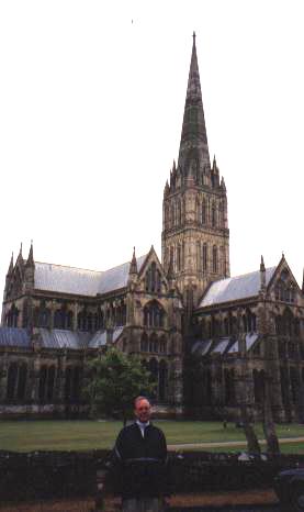 Flat countryside was again behind us - we weren't especially fond of what we saw in our path. We made several climbs and an especially long climb prior to Bruton and then a quick descent into the town. We continued on the B3081 and more tough climbs. We cycled parallel to the A303 to take advantage of a more gradual incline. We joined the B3092, cycled under the A303 and headed into Mere for our lunch stop. From Mere we cycled into another maze of country roads towards the A350 and East Knoyle. After crossing the A350 we tried to plan our route to avoid another large hill. But no luck, we missed a valley route and instead climbed yet again before descending into Tisbury. From here to Salisbury the countryside was much flatter. We joined heavy traffic on the B3089. A strong tailwind helped us quicken our pace to 35 Kph all the way to Wilton. At Wilton Tom stopped to get some cold medication. While in the drug store Tom's feathered rear tire gave way with a loud boom. This was actually a humourous experience for Kevin. Just as the "explosion" occurred, several young teenagers were walking by. Not only did the blast scare the living daylights out of them, but Kevin initially thought they were playing a gag on him by exploding firecrackers nearby. Ironically, the teens had just bought a tire repair kit from a local store and offered to help. The rear tire was a write-off. Fortunately, Kevin had some tire repair tape that he used to line the feathered sections inside the tire - it was deemed that five sections of tire needed the repair tape. The temporary fix held for the remaining 10 Km into Salisbury. With a late start, a long ride and a flat tire we just made the Tourist Information Office 5 minutes before closing at 6PM. The office clerk seemed to take pity on this sniffling tourist and after several calls helped book a B&B. It was 7PM by the time we had checked-in and were ready for dinner. There was much to see in Salisbury, we decided to forgo the next day's cycle to Winchester and stay two nights in Salisbury. We walked downtown for dinner, and along the way we met another cyclist asking for directions. We were actually able to help him out, as he was staying at the same bed and breakfast as ourselves. He was quite grateful for our help, as he had overextended himself that day by cycling over 120 km into headwinds. We continued on our way to the downtown area where we strolled into a pub to sample yet another beer. Two young chaps noted our accent and stuck up a conversation with us. These two chaps were well primed with beer and kept us entertained while one called his Uncle "Knobby" on his cell phone. "Talk to Uncle Knobby - he lives in Canada too," the inebriated, but jovial lad said. After talking to his uncle for a few minutes we found out he lived only 45 minutes away from our homes, in the village of Strathroy. We greatly enjoyed the banter and often thought of how these two fellows must have coped the next day.