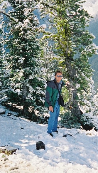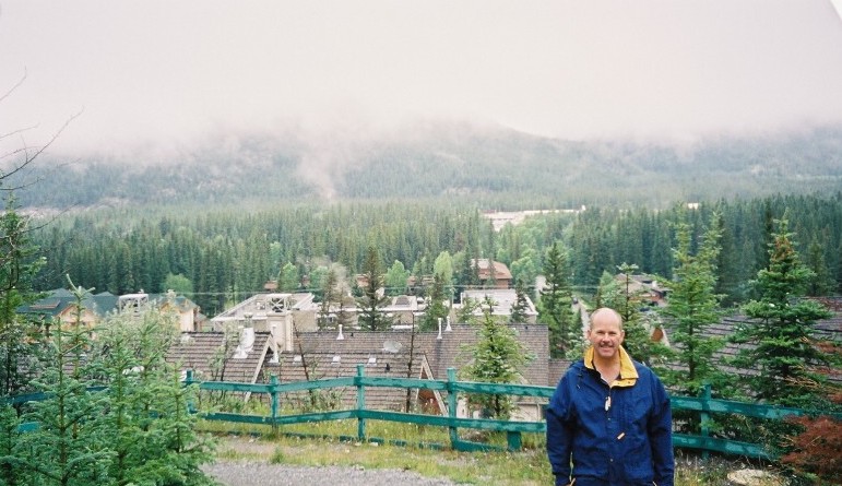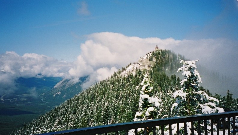 During the night, it had rained in Banff, and the streets were wet in the morning. Low, fall-like heap clouds permeated the skies. In the higher levels, snow had fallen, and the mountains took on a new look. We used this day to see the sights of Banff, and do a little bit of shopping. We ended up touring the Banff Springs Hotel, then taking a taxi to the Sulphur Mountain Gondola about $7.00, including tip from the Banff Springs Hotel. We spent a few hours on top of the mountain admiring the sights down below us, and inspecting the snow that had fallen on the top of the mountain the previous night. This snow made some of the walkways treacherous, and some were even closed off for the day. By about 2:00 p.m. the skies started to break up, and we enjoyed bright sunshine for the remainder of the day.