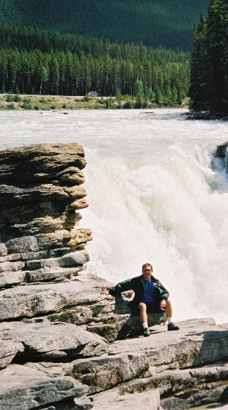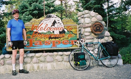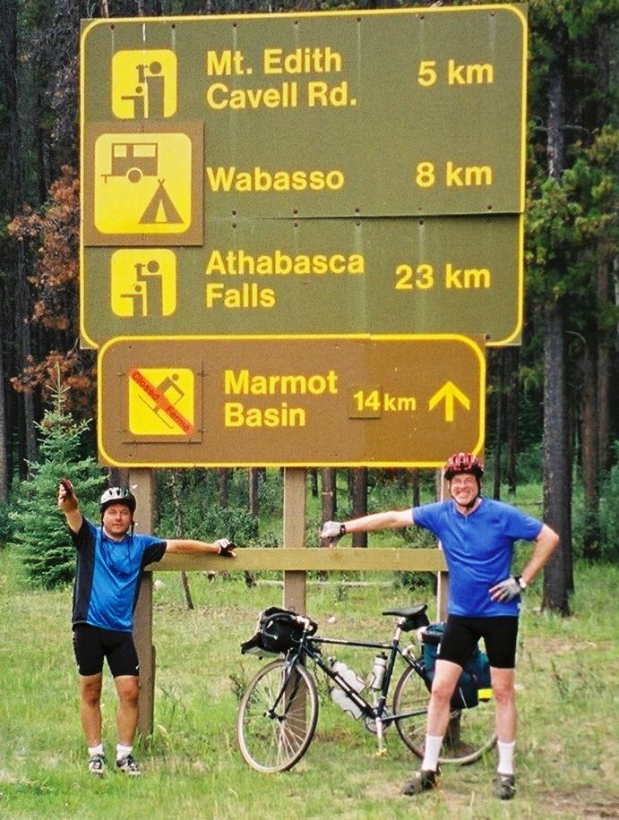 Originally, we (and when I say we, I should say, I) had planned this day to end up at the Mount Edith Cavell Hostel. Tom and Paul had other ideas, however. Tom and Paul are not "hostel" people. Tom and Paul are not campers either. Tom and Paul like hot showers. Tom and Paul dont like sharing their bedroom with 9 other strangers. Since our arrival in Rampart Creek, they had been planning their mutiny. They wanted a hotel, with hot and cold running water, a shower, and less than four people to a room. I was outvoted, and this day we bypassed Mt. Edith Cavell entirely! We would have to forfeit almost $50 for the nights stay, and pay an additional $160 for a night in a hotel. I guess to them, though it was worth it. To me, I think I was trying to get back some childhood memories. Some of my fondest times were camping in the Canadian Rockies with my dad. Mount Edith Cavell held some great memories for me. My mom still delights in telling stories of how her six year old son climbed half way up Mt. Edith Cavell. I am sure it was only a couple hundred feet or so, up some well groomed path. Todays journey was mostly downhill. Early in the morning, on my way to the impressive Beauty Creek outhouse (it has some interesting quotes to peruse while one does his or her "business"), it was very foggy, and you couldnt see more than ¼ km. By the time we left, however, there was bright sunshine and no evidence of any fog. The temperature eventually warmed up to 23º, and we were able to finally cycle in shorts and jerseys. We left Beauty Creek around 10:15 a.m. After 32 kilometres, one bee sting to my temple, and 1hour and 25 minutes of cycling, we reached Sunwapta Falls. This is a fast moving, narrow falls, with a rather large drop off through a rocky gorge. There are all sort of hiking trails along the sides of the Sunwapta River around the falls, as well as a wooden footbridge to cross for a view from the other side. We spent about a half-hour at the Falls before proceeding out the road intersection for lunch at the restaurant. We finished lunch and resumed our journey at 1:15 p.m. Our next stop would be at the equally breathtaking Athabasca Falls. The 24 kilometres took us the better part of an hour. Athabasca Falls had more water dropping down a similar gorge to the one in Sunwapta, but I for one did not find it as spectacular. It was also more crowded. We bumped into a German couple we had met the previous night in Beauty Creek, and they agreed to take our group shot by the Falls. Cycling out, we stayed on the main highway, #93, instead of 93A. This meant that we would certainly bypass Mt. Edith Cavell. I rode by myself, several kilometres ahead of Paul and Tom. I stopped at the junction where the two roads rejoined, just after crossing over the Athabasca River and waited for my two "comrades." From this point it, was 5 kilometres back to the junction of the Mt. Edith Cavell Road. I had contemplated starting out on my own, but I wanted to remain friends with the others, so I waited. Besides, there was a park entrance, and I didnt know if they could get through without the National Park Pass, which was in my possession. Upon their arrival, Paul said that they would go on to Jasper, but I was free to go to Mt. Edith Cavell if I wanted. I thought about the logistics, and I capitulated and agreed to accompany them to Jasper. Mt. Edith Cavell would have to wait. We did however take a few pictures in front of a directional sign showing the distance to the turnoff me with a "thumbs up," Tom and Paul indicating a "thumbs down." Isnt democracy wonderful? We arrived in Jasper at 4:40 p.m., covering 92.8 K in 3 hours and 51 minutes of cycling time, for an average speed of 24.1 kph. I attained a maximum speed of 71 kph. I thought at one point I would surpass my downhill record of 79 kph (also achieved on this trip), but alas, a van pulled out 1/3 down the hill and I had to brake to stay behind him. I guess thats not bad, considering this was in a 50 kph zone! We found a hotel called the Tonquin Inn, which was very nicely situated and answered the needs of Paul and Tom quite nicely. OK, I admit it - I did enjoy that warm shower, as well!