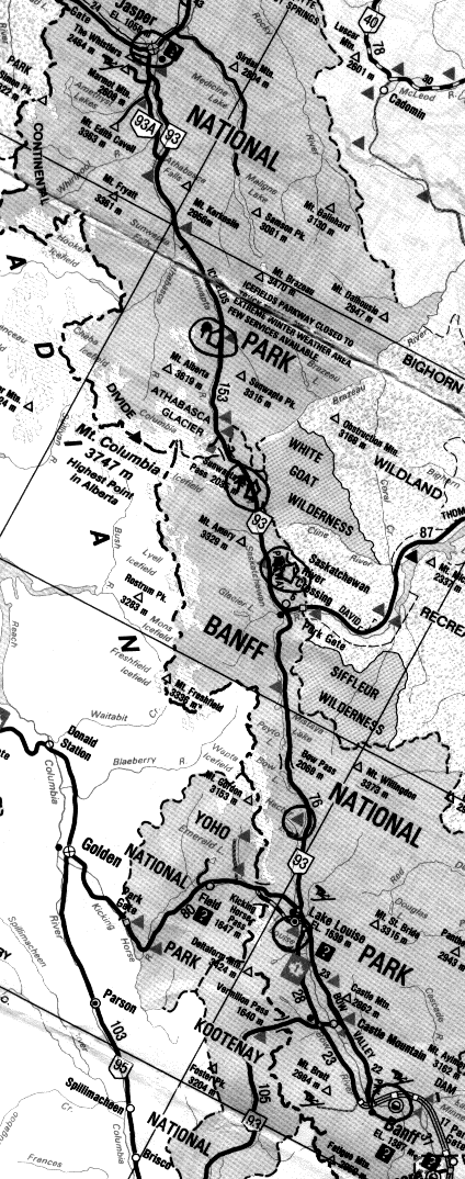 MAP OF PARKWAY SHOWING BOW VALLEY PARKWAY FROM BANFF TO LAKE LOUISE, AND THE ICEFIELDS PARKWAY LAKE LOUISE TO JASPER